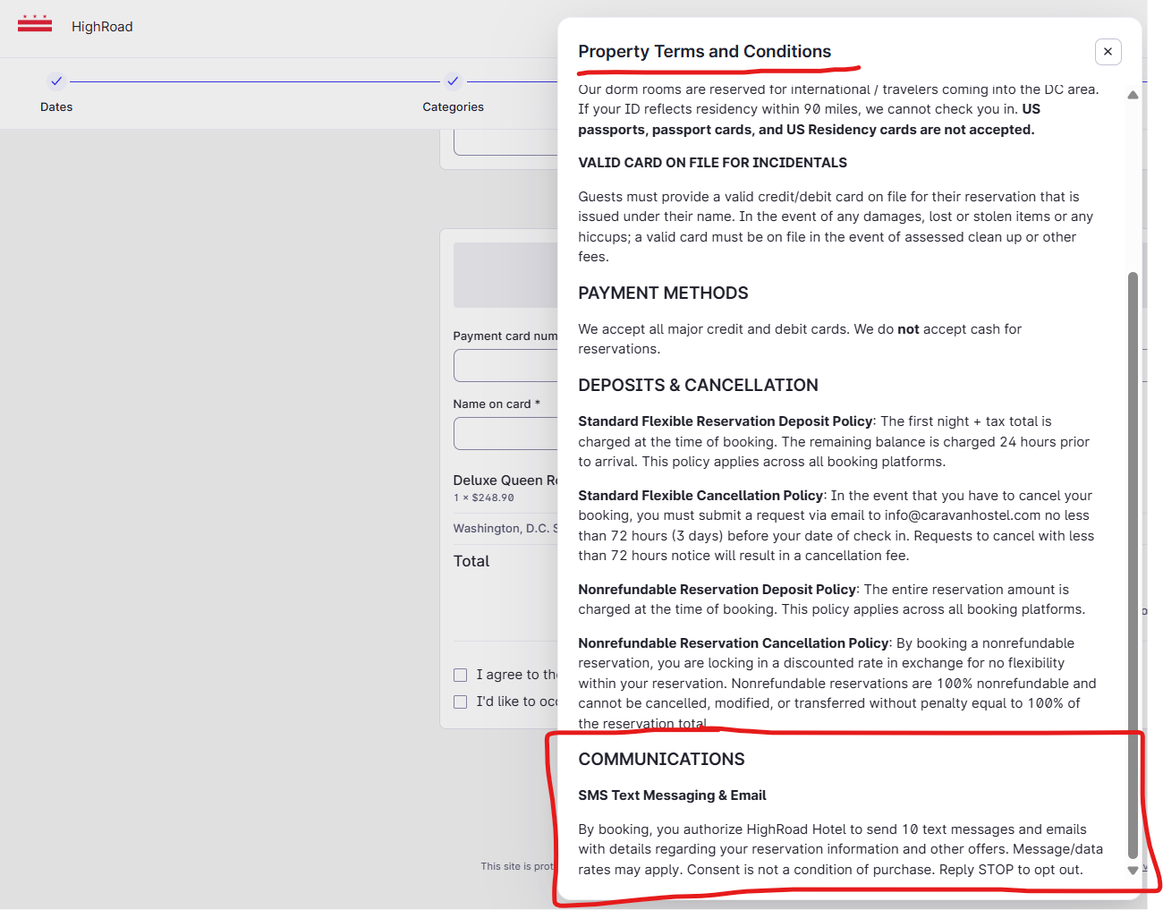 End users opt-in by visiting www.HighRoadHotel.com and making a reservation for the hotel and must click a checkbox to agree to the terms and conditions of the hotel which include agreeing to receive up to